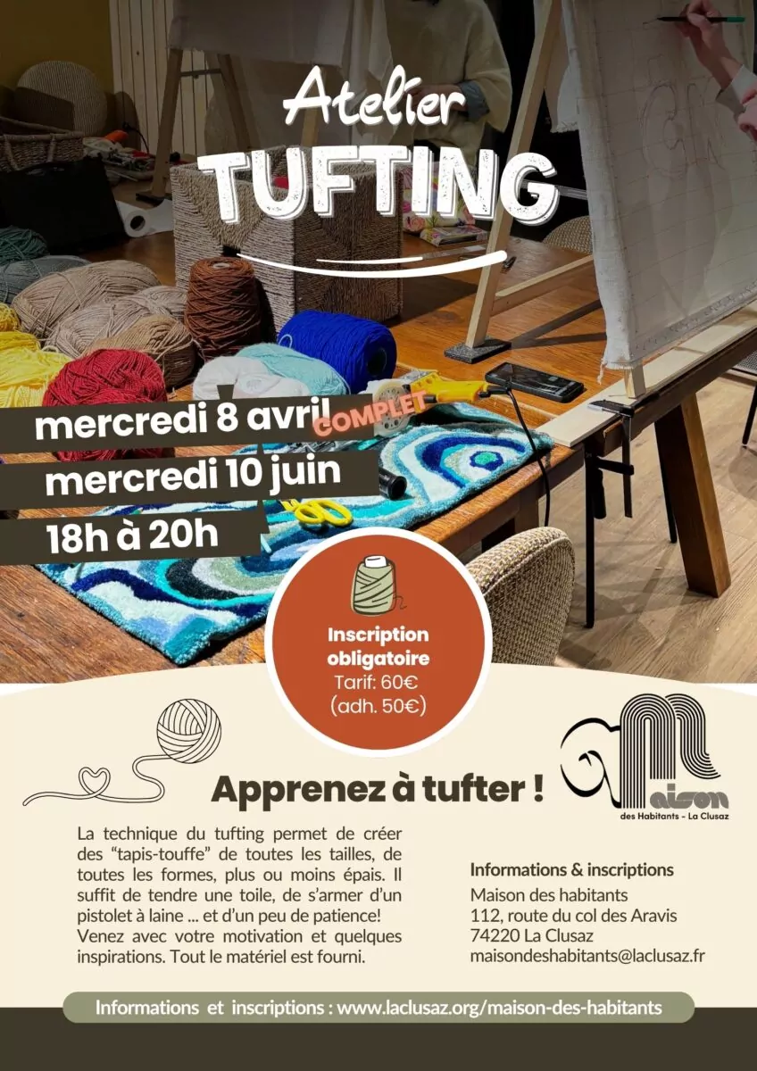 Accueil Actualités Activités Maison des Habitants Atelier tufting Atelier tufting Apprenez à tufter! Actualité publiée le vendredi 03 avril 2026 Activités Maison des Habitants Télécharger en PDF Imprimer Partager ✓ Lien copié Précédent Retour aux Actualités Suivant