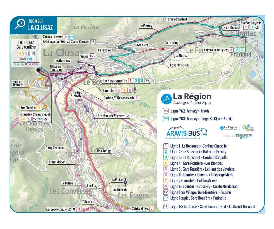 • un réseau connecté avec les lignes de bus interrégionales Y62/Y63 : Gare routière d’Annecy / Gare SNCF 🔁 Gare routière de Thônes 🔁 Gare routière de La Clusaz.