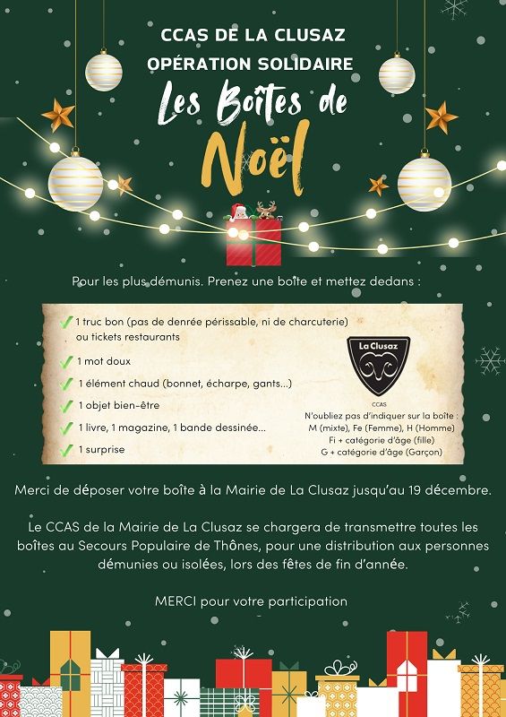 A l'occasion des fêtes de fin d'année, le CCAS de la Mairie de La Clusaz lance la grande collecte des Boîtes de Noël pour apporter un peu de douceur aux familles et aux personnes en situation de précarité.