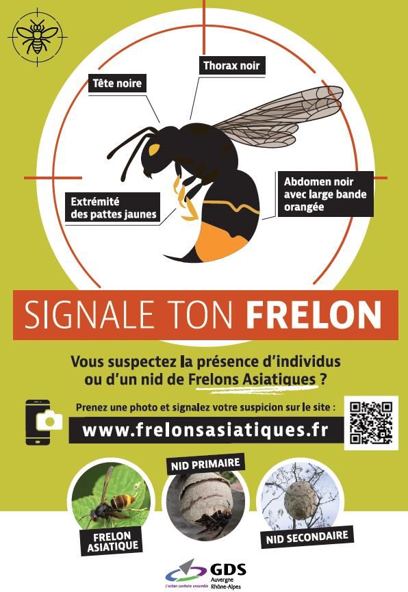Concernant la prévention, la surveillance et la lutte contre le frelon asiatique en Auvergne Rhône-Alpes, la campagne de la FRGDS (Fédération Régionale des Groupements de Défense Sanitaire) en Auvergne Rhône-Alpes incite à la plus grande vigilance (en 2022 le nombre de nids découverts a été multiplié par deux par rapport à 2021).